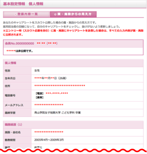 マイページ内の「個人情報」より、園・施設側からの見え方を確認することが出来ます。 氏名や生年月日、住所、連絡先、勤務先等については公開されません。